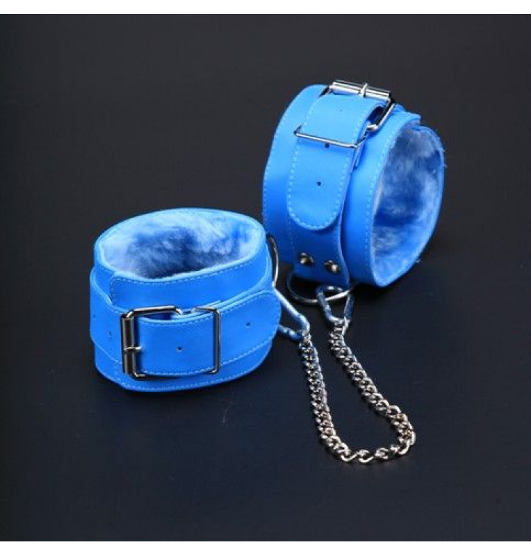 Оковы. Изготавливаются из искусственной кожи. С внутренней стороны подкладка их мягкого меха. При изготовлении использована фурнитура с никелевым покрытием. Соединяются между собой собой цепочкой с двумя карабинами на концах. Не нарушают кровообращение, надёжно фиксируются на щиколотках. Размер универсальный. Цвет: голубой. Длина цепочки - 35 см.