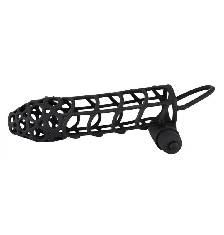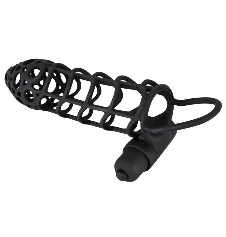 Чёрная закрытая насадка-сетка на пенис с вибрацией Black Velvet - 14 см.