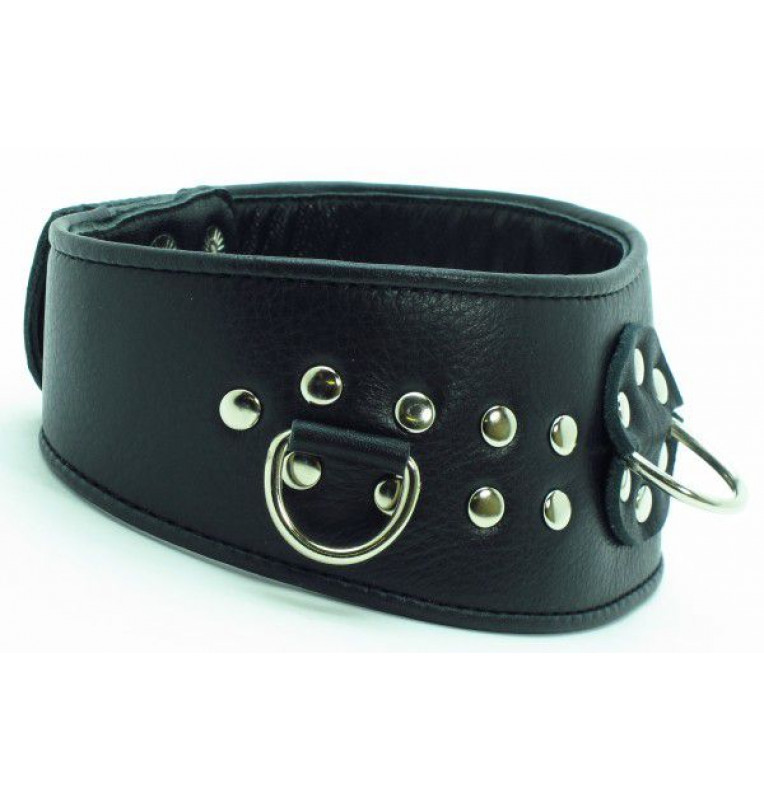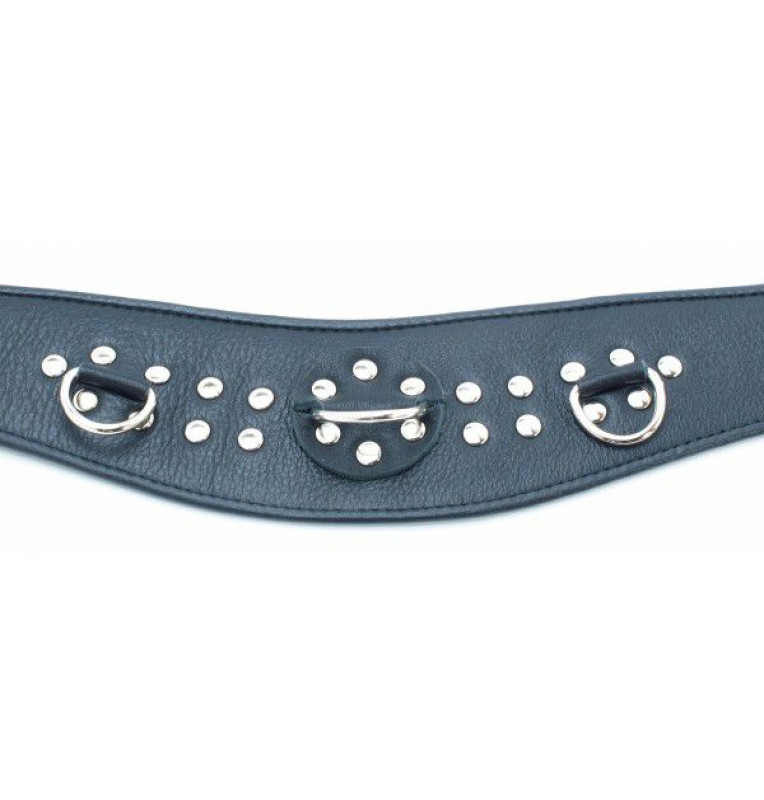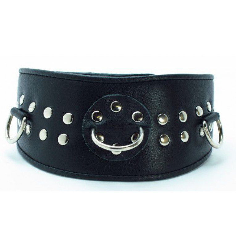 Кожаный ошейник для эротических игр имеет три крепления для поводка или наручников. Выполнен с применением металлических клепок.
