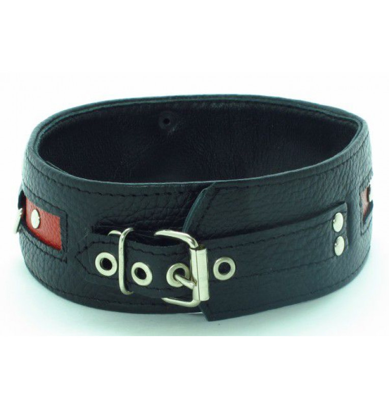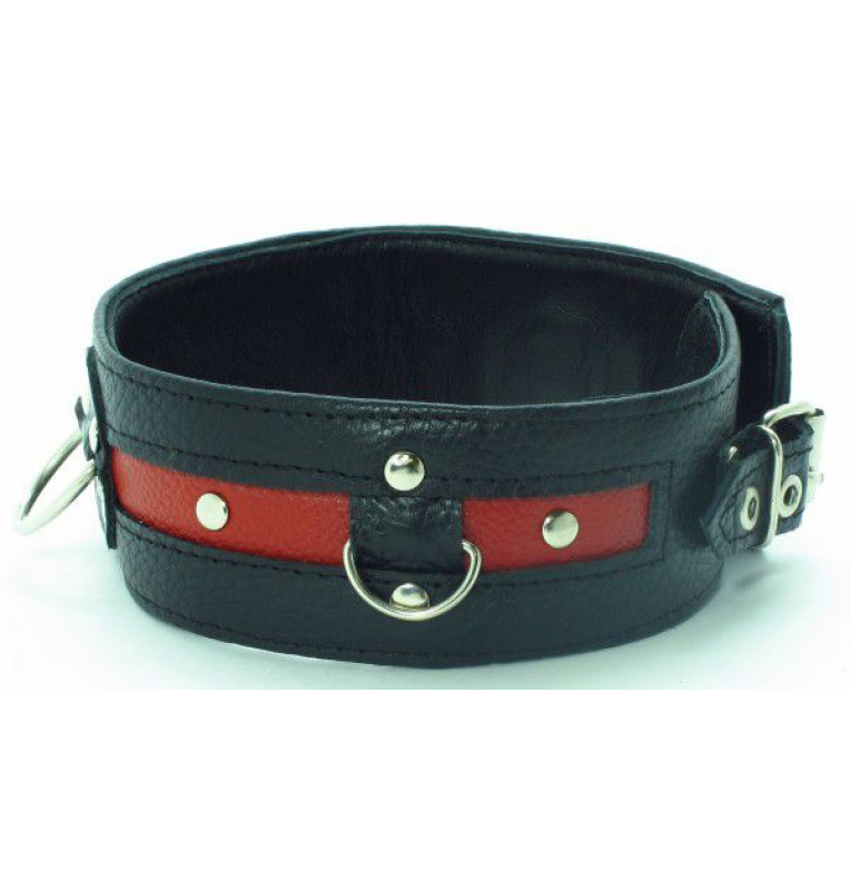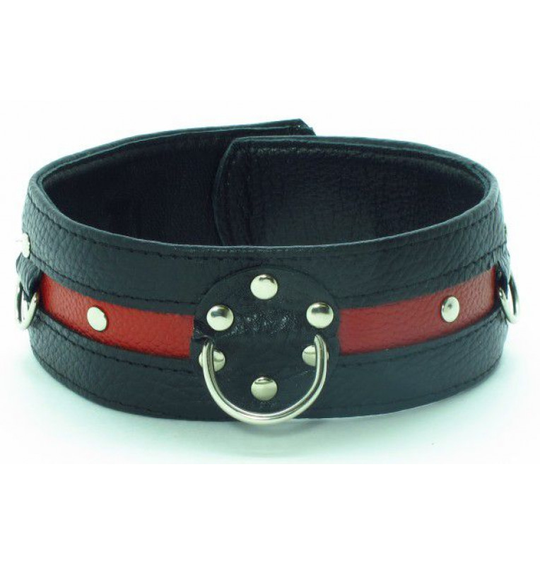 Стильный ошейник с красной полосой и металлическими заклепками обязательно понравится любителям БДСМ-игр. К пряжке можно пристегнуть поводок или наручники.