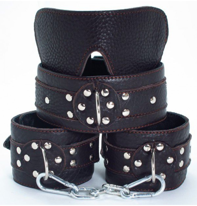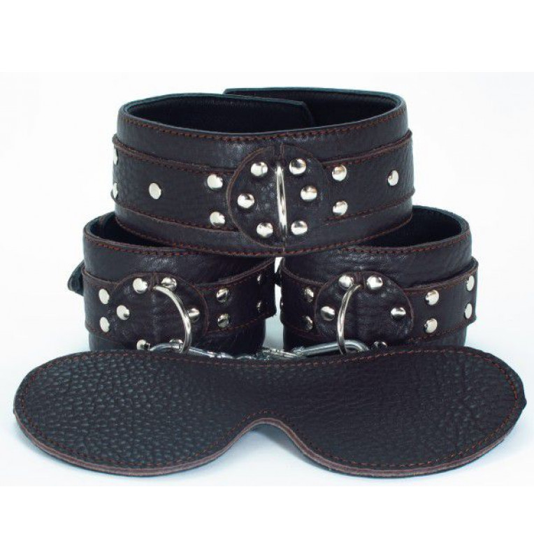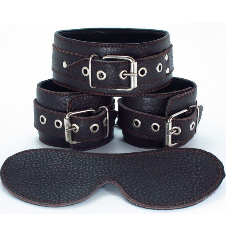 Набор БДСМ-аксессуаров из мягкой кожи черного цвета. В комплекте: маска на глаза, ошейник, манжеты-наручники.