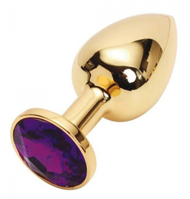 Золотистая металлическая анальная пробка с фиолетовым стразом - 7,6 см.