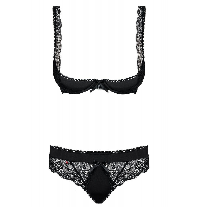 Мягкое нежное кружево и дизайн, подчеркивающий женские прелести. Комплект для девушек, которые готовы показать, насколько они горячи. Бюстгальтер – открытый, эффектно приподнимающий грудь благодаря плотным чашкам на косточке. Вставки добавляют объем для полного совершенства. Бретели – регулируемые, чтобы лиф был комфортным и идеальным по формам. Кокетливые трусики-стринги из удобного трикотажа, с широкой резинкой. Декорированы узорным кружевом и украшены спереди милым атласным бантиком. В комплекте: лиф, трусики-стринги.