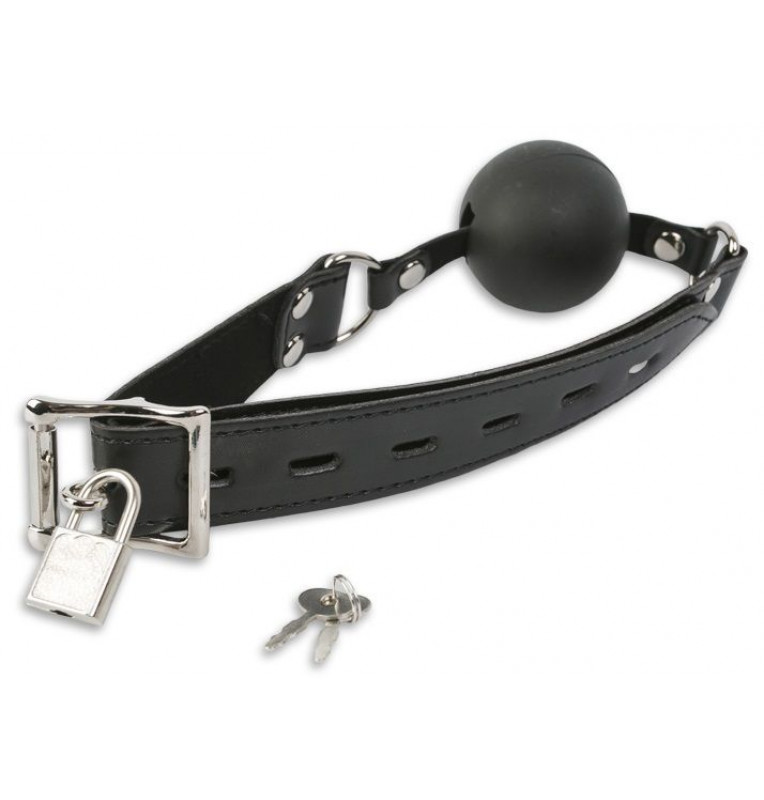 Теперь ваш партнер не только не сможет говорить во время ролевой игры БДСМ, но и снять с себя кляп раньше времени. Аксессуар с замочком обязательно понравится любителя оригинальных девайсов. Кляп имеет вид пластикового шарика, который крепится на ремешке из кожзаменителя. По размеру ремень регулируется пряжкой. Выбранный размер можно зафиксировать еще и замочком. Диаметр шарика - 4,5 см. Максимальный обхват - 60 см.
