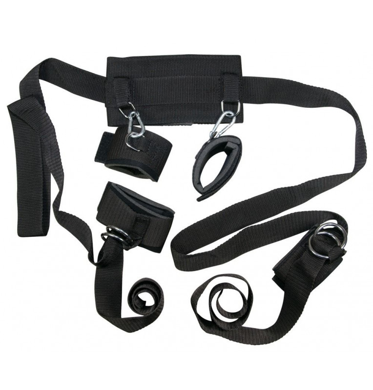 Ременная фиксация Fessel-Set. Состоит из ошейника, соединенного с наручниками и браслетами на ноги. Ширина ошейника - 10 см. Длина ремней от ошейника до браслетов на ноги - 155 см.