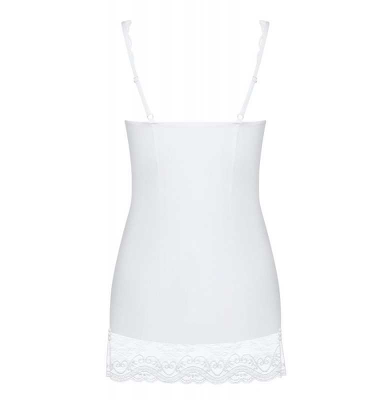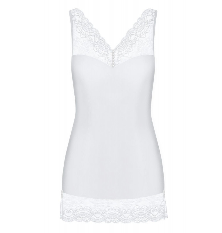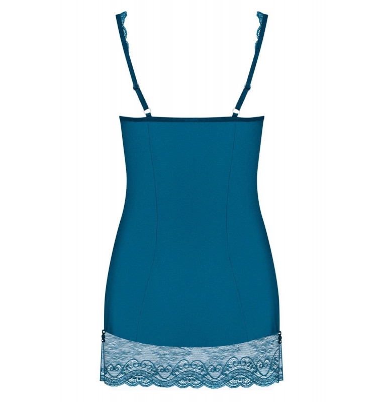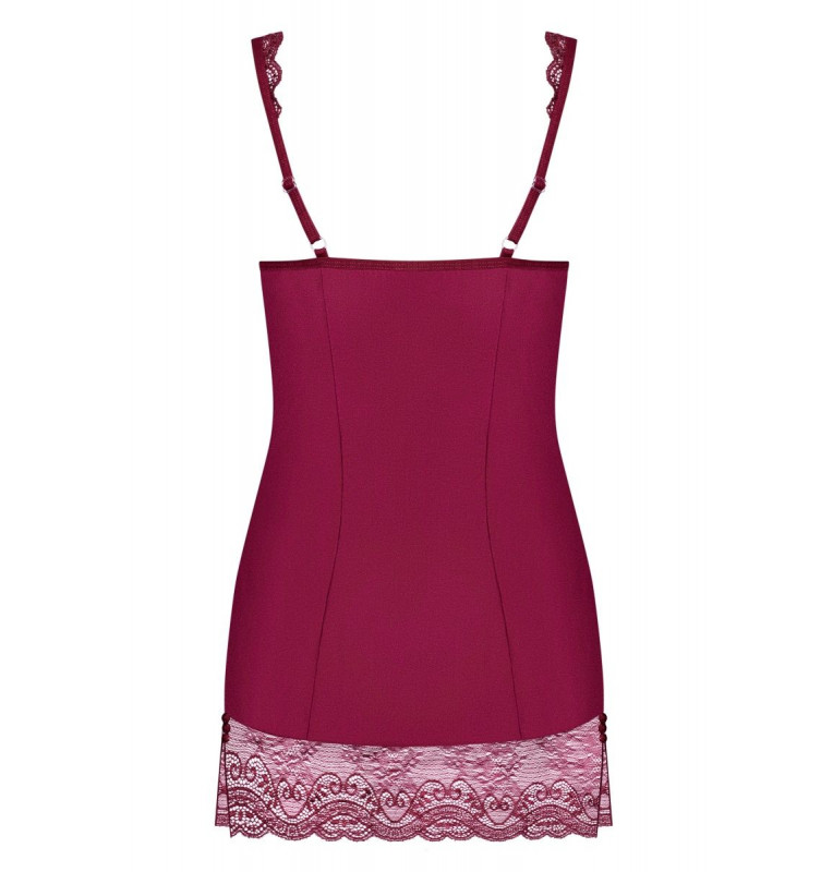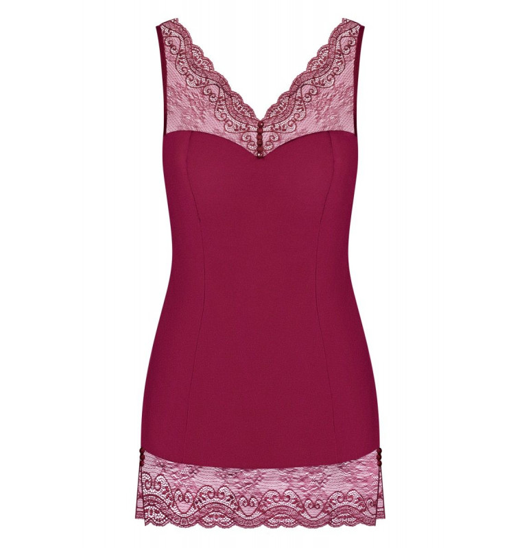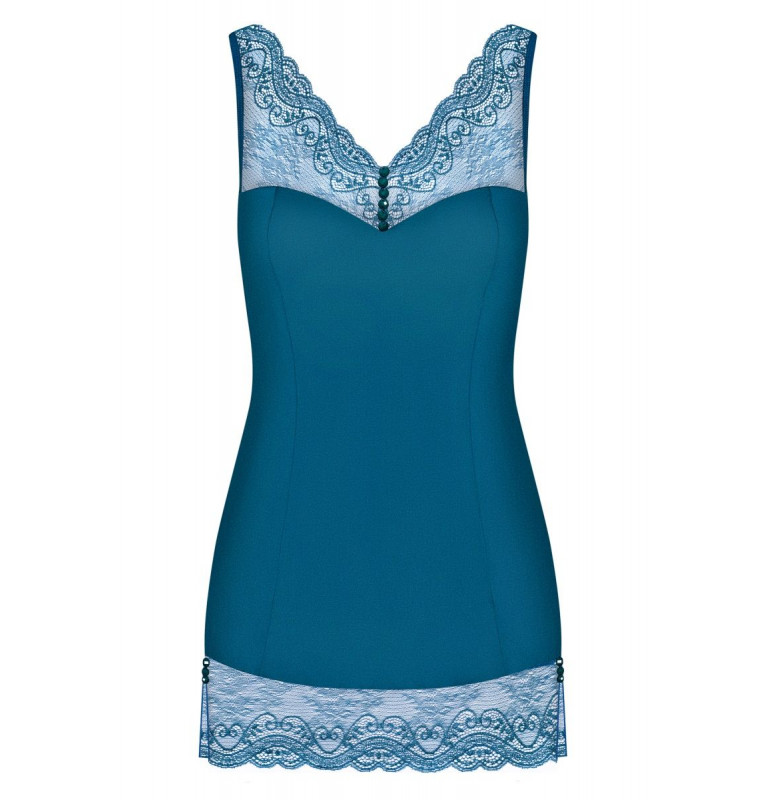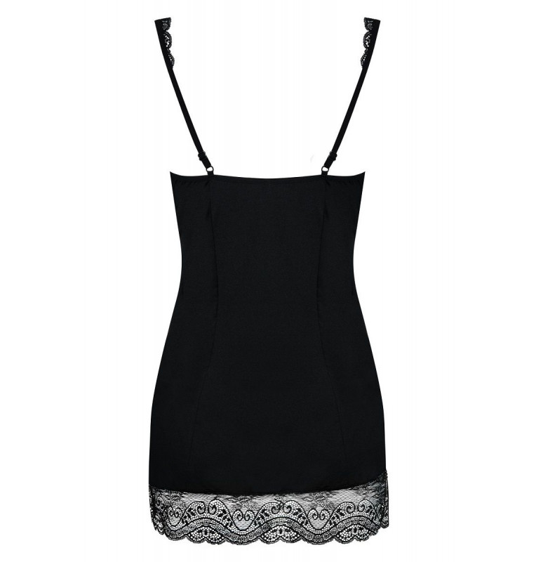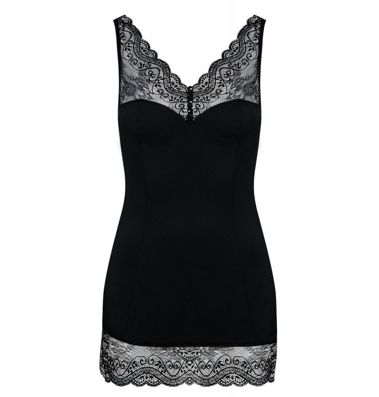 Классическая черная сорочка, вверху и внизу сорочки вставки из кружева с цветочным рисунком, V-образный вырез украшена рядом маленьких граненых пуговичек. Внизу на сорочке по бокам небольшие разрезы, верх разреза украшен рядом маленьких граненых пуговичек. Бретели регулируются по длине. В комплекте трусики стринги. В комплекте: сорочка, трусики-стринги.