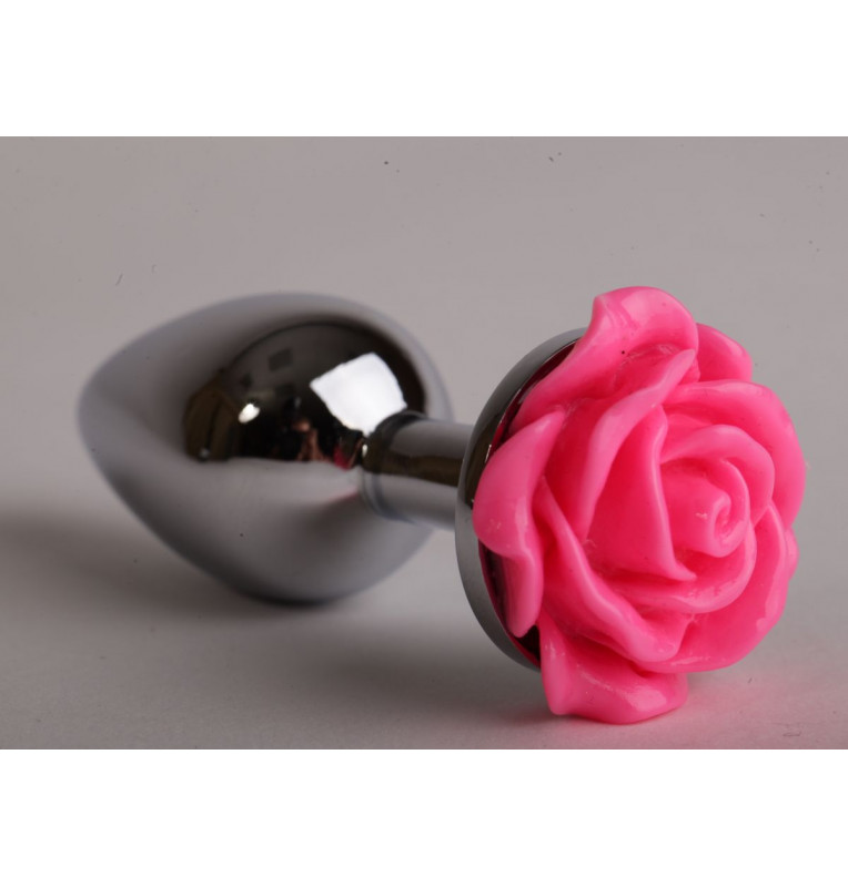 Серебристая анальная пробка с розовой розочкой - 9,5 см.