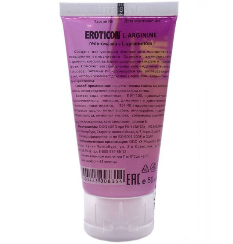 Гель-смазка стимулирующая на водной основе. В настоящее время гелевое применение L- аргинина рекомендуется для лечения сексуальной дисфункции у женщин, а также эректильной дисфункции у мужчин. При нанесении на кожу эта аминокислота вызывает расширение сосудов и прилив крови, что увеличивает силу и продолжительность кровенаполнения половых органов как у мужчин, так и у женщин. Аргинин нормализует функции желез, вырабатывающих собственную смазку. Аргинин помогает заживлению микротрещин и восстановлению поврежденных кожных покровов, усиливает приятные ощущения и продлевает время интимного контакта. Никотинамид (витамин РР) широко используется в косметике как разогревающий агент, усиливает действие L-аргинина.