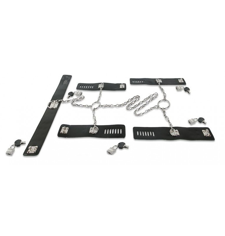 Здесь всё, что нужно для надежной фиксации партнера. Пусть он не будет прикован к кровати или распорке, однако ходить и работать руками он не сможет. Сегодня будет всё исключительно для удовольствия Господина! Универсальный набор представлен пятью манжетами, которые соединяются цепочками. Ошейники и две пары фиксаторов для рук и ног позволят вам зафиксировать партнера в удобном для вас положении. Все элементы набора сделаны из кожзаменителя. Размер манжет регулируется. Ширина ремней - 6 см. Длина наручников - 24 см. Длина оков - 28,5 см. Длина ошейника - 44 см.