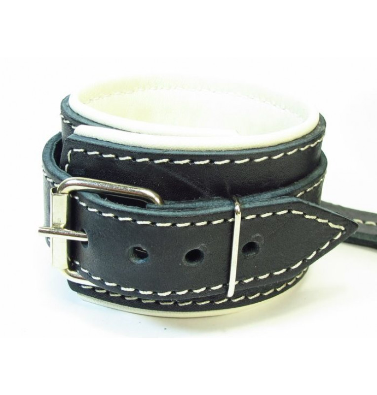 Оковы на ноги с бежевым подкладом. Выполнены из толстой ременной кожи черного цвета, подклад мягкая перчаточная кожа светло бежевого цвета. На пряжке. Использована усиленная металлическая фурнитура. Строчка толстой ниткой контрастного светлого цвета.