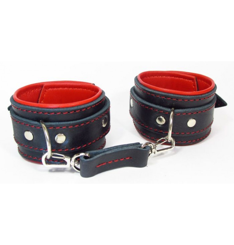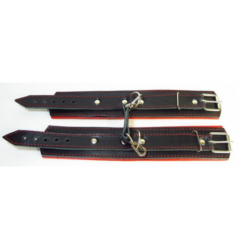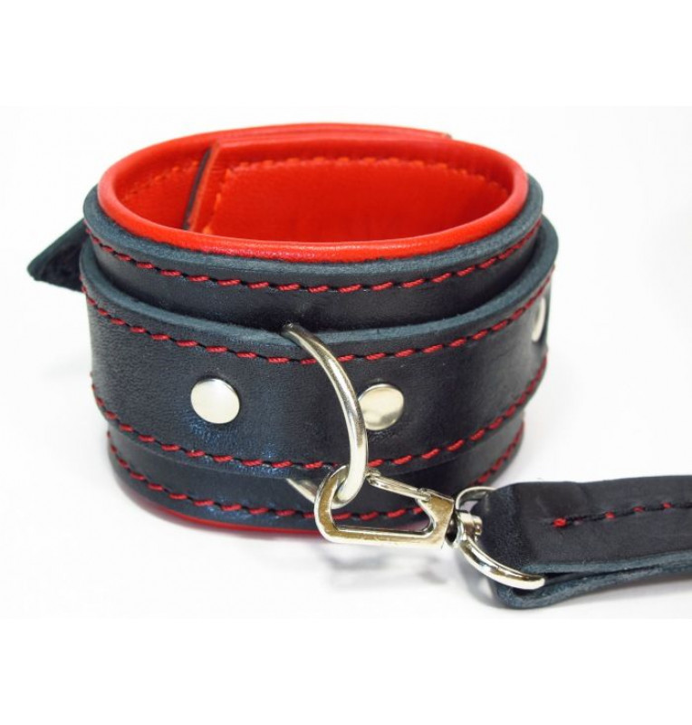 Оковы на руки с красным подкладом. Выполнены из толстой ременной кожи черного цвета, подклад мягкая перчаточная кожа ярко красного цвета. На пряжке. Использована усиленная металлическая фурнитура. Строчка толстой ниткой контрастного красного цвета.