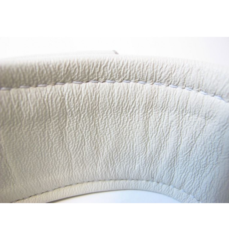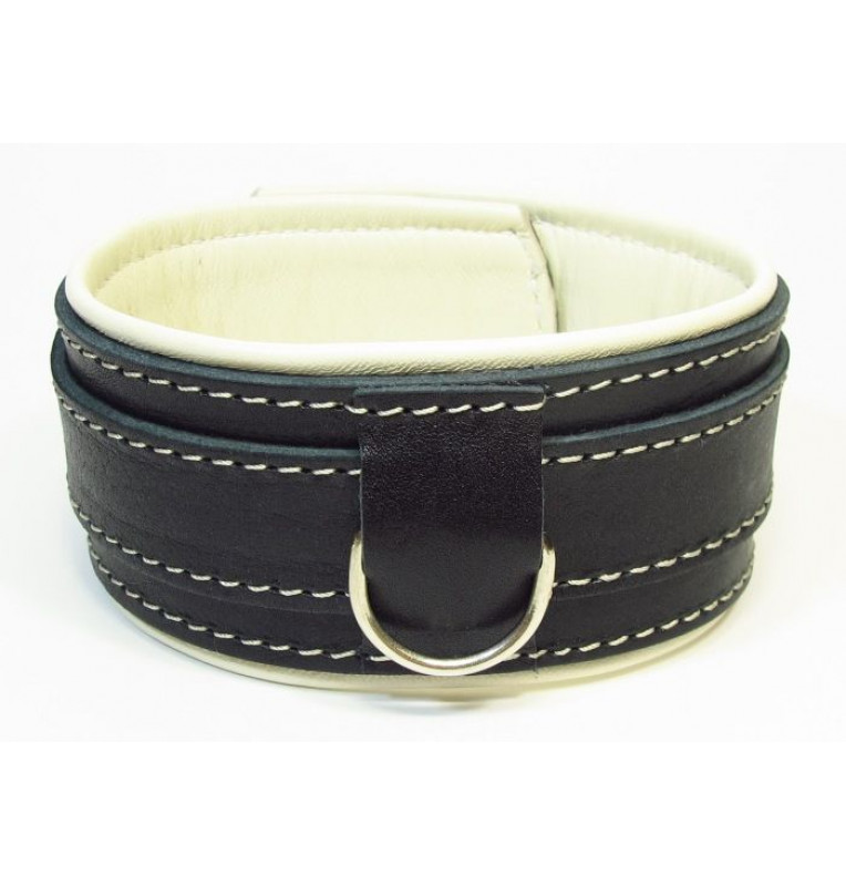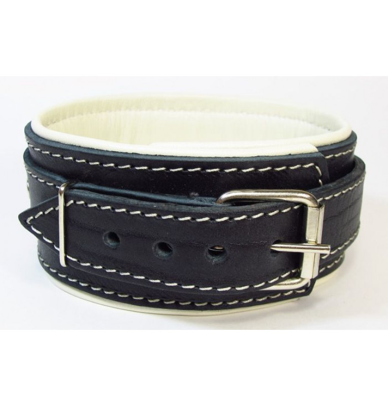 Ошейник с бежевым подкладом. Выполнен из толстой ременной кожи черного цвета, подклад мягкая перчаточная кожа светло бежевого цвета. На пряжке. Использована усиленная металлическая фурнитура. Строчка толстой ниткой контрастного светлого цвета.