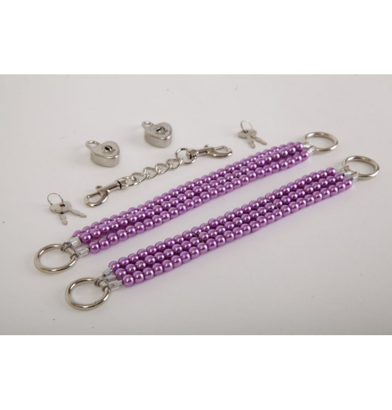 Красивые наножники из фиолетового жемчуга с замочками в виде сердца и четырьмя ключиками. Чтобы ограничивать движения есть небольшая цепочка с двумя карабинами. Упаковка - картонная золотая коробка с бантиком. Длина соединительной цепочки - 13 см. Длина браслетов - 26 см., ширина - 2,5 см.