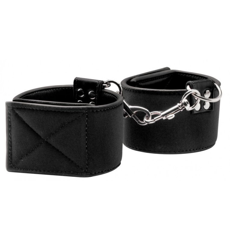 Одна из с торон этих оков полиуретановая, а другая — неопреновая, и это позволяет выбирать касающийся вашей кожи материал простым выворачиванием манжет на другую сторону. Неопреновая сторона цветная, а полиуретановая — чёрная, для придания грубости её внешнему виду! Они также снабжены застёжками-липучками, благодаря чему подойдут практически каждому. Материал - неопрен, полиуретан.