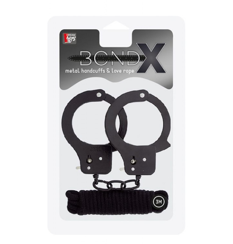 Чёрные наручники из листового металла в комплекте с веревкой BONDX METAL CUFFS LOVE ROPE SET