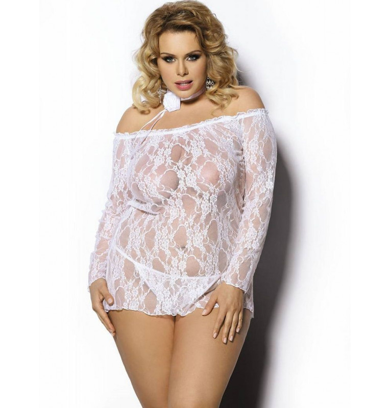 Короткая полупрозрачная сорочка из высокоэластичного кружевного полотна с длинными рукавами. В комплект входят трусики. В комплекте: сорочка, трусики-стринги.