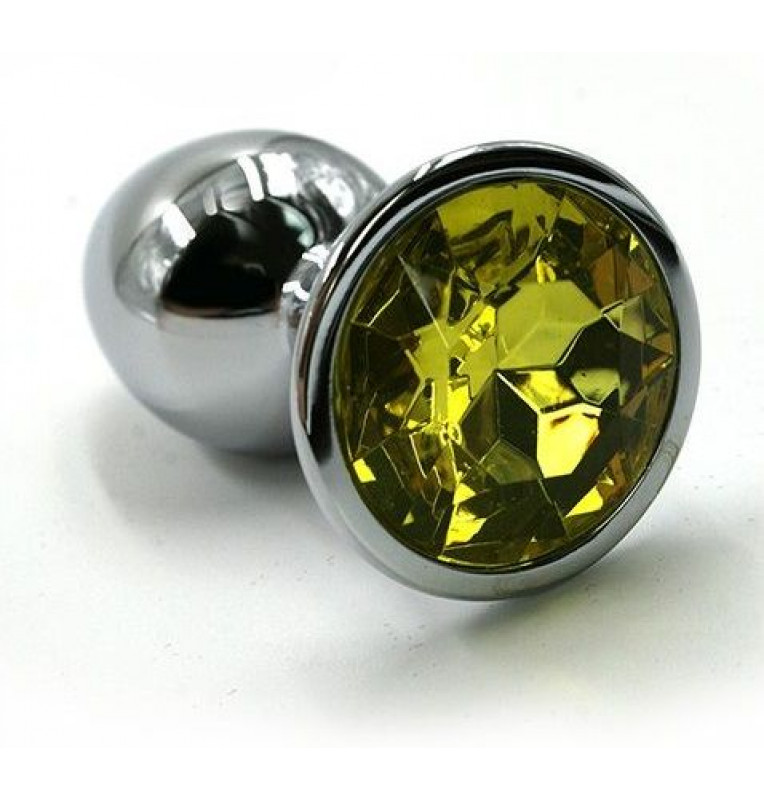 Анальная пробка из алюминия размер S. Страз в основании круглой формы, выполнен из стекла желтого цвета. Упакована в вельветовый мешочек для хранения. Вес - 52 гр.