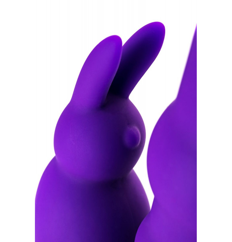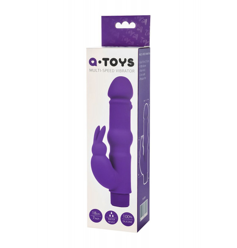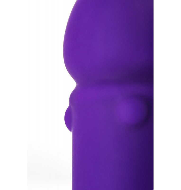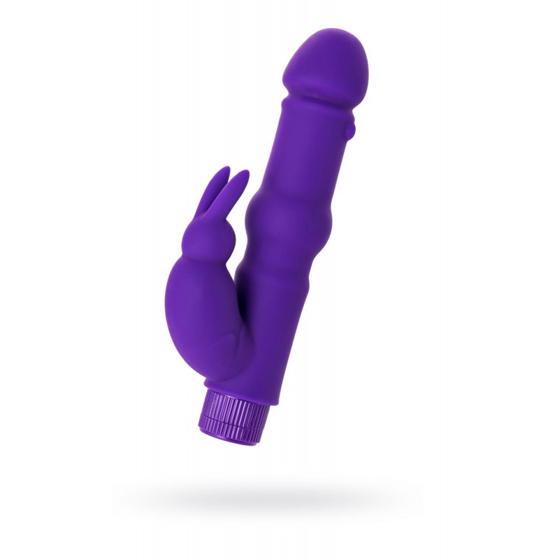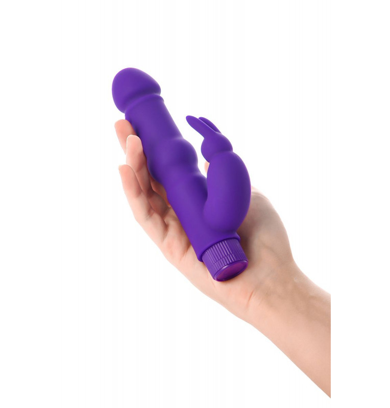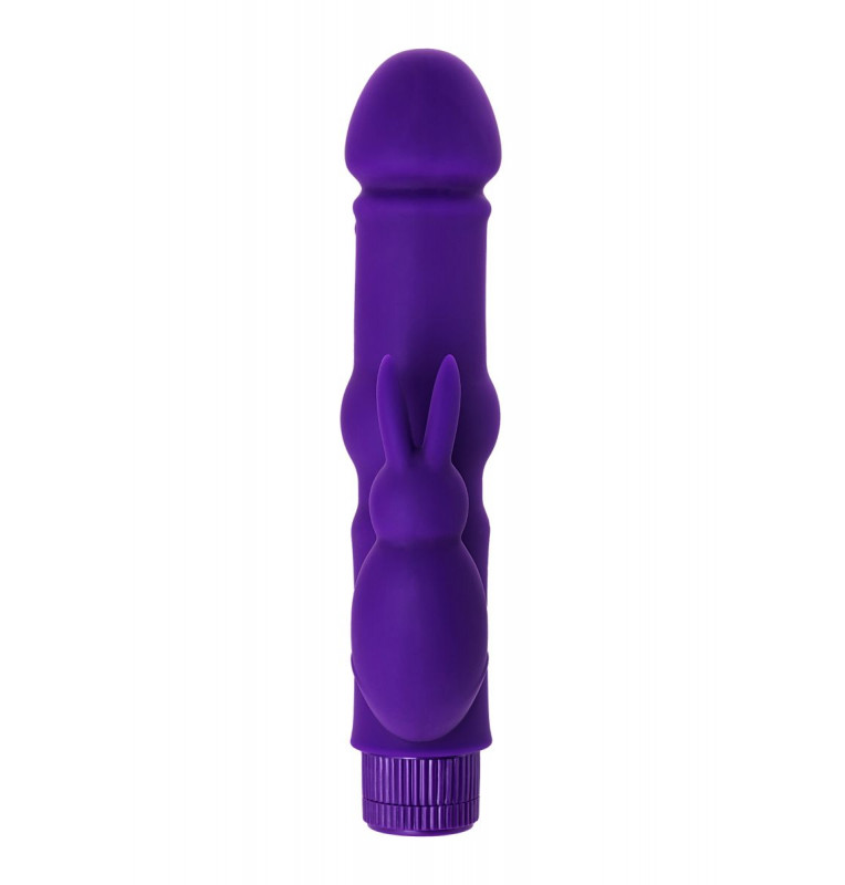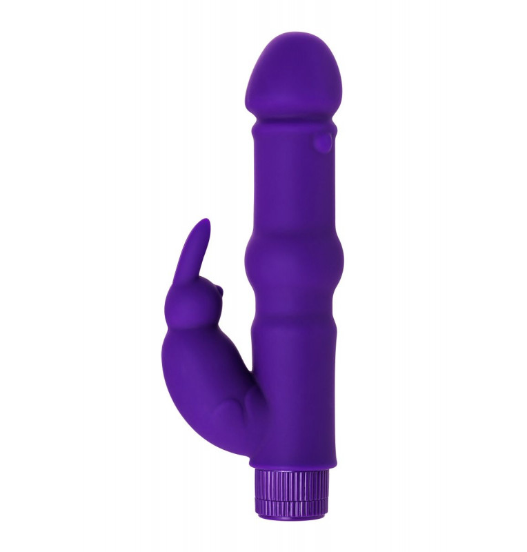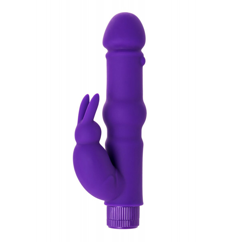 Фиолетовый вибратор с утолщением посередине и клиторальным зайчиком - 18 см.