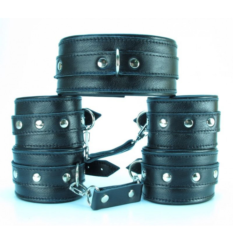 Набор аксессуаров, изготовленных из натуральной кожи. В него входят: наручники и оковы, украшенные заклепками, которые можно соединять и комбинировать между собой при помощи прочных перемычек с карабинами (входят в комплект). Размер меняется при помощи застежки. Также имеется ошейник с одним кольцом. Размер регулируется застежками. Модный интимный аксессуар не сдавливает и не нарушает кровообращение, так как изготовлен из мягкой кожи. Ширина оков - 5,7 см. Длина перемычек - 6 см. Ширина ошейника - 5,7 см.