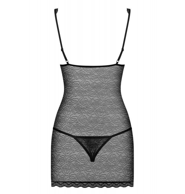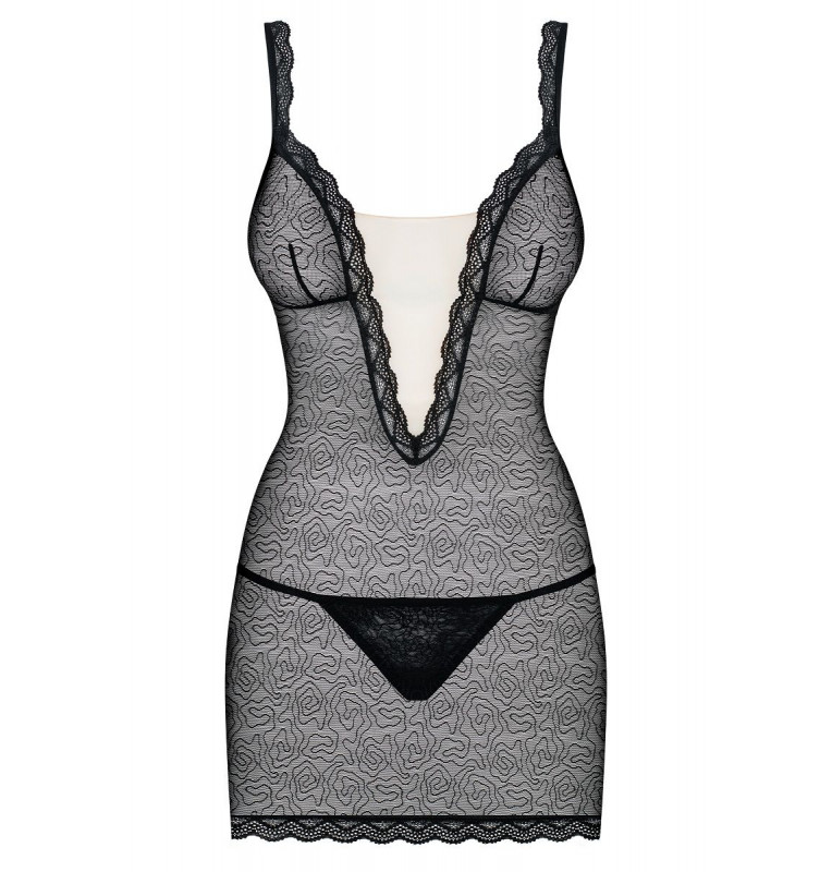 Соблазнительная сорочка из двух видов материала. Глубокий V-образный вырез декольте. Изысканное кружево с завитками. Регулируемые бретели. В комплекте: сорочка, трусики-стринги.