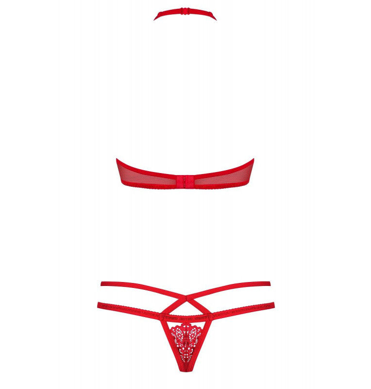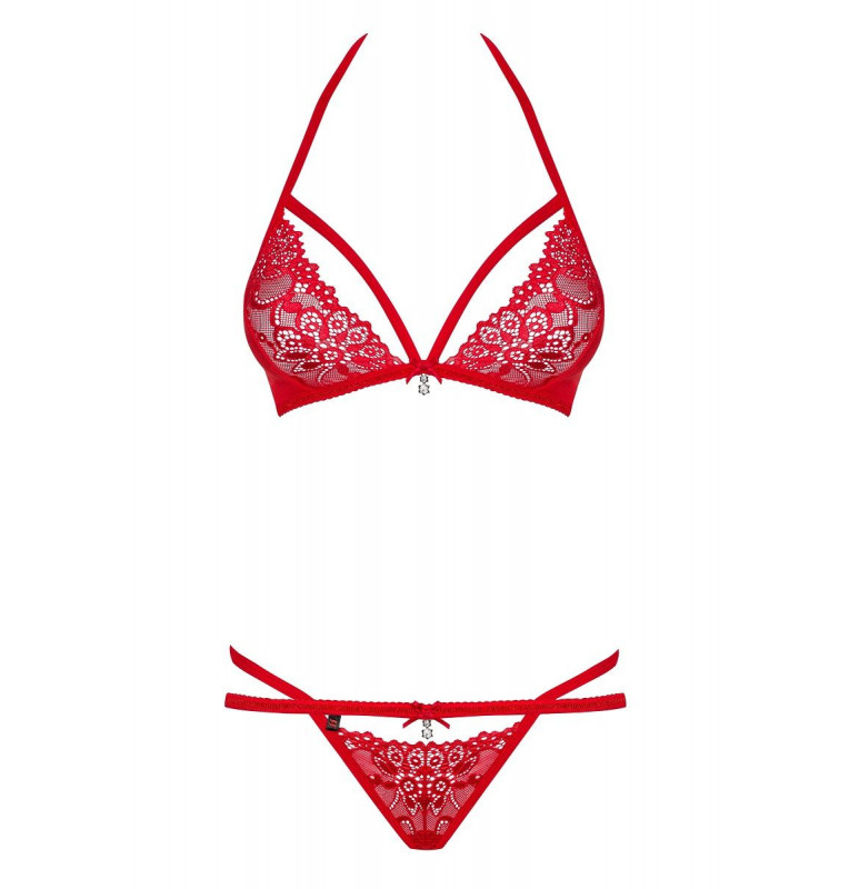 Кружевной комплект: бюстгальтер, мягкая треугольная чашка, бретели застегиваются вокруг шеи и застегиваются на спине. Трусики стринги. Бюстгальтер и трусики украшены атласным бантом и подвеской со стразами. В комплекте: бюстгальтер и трусики-стринги.
