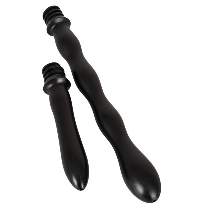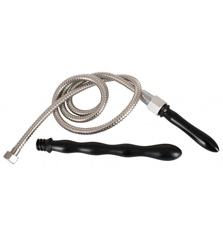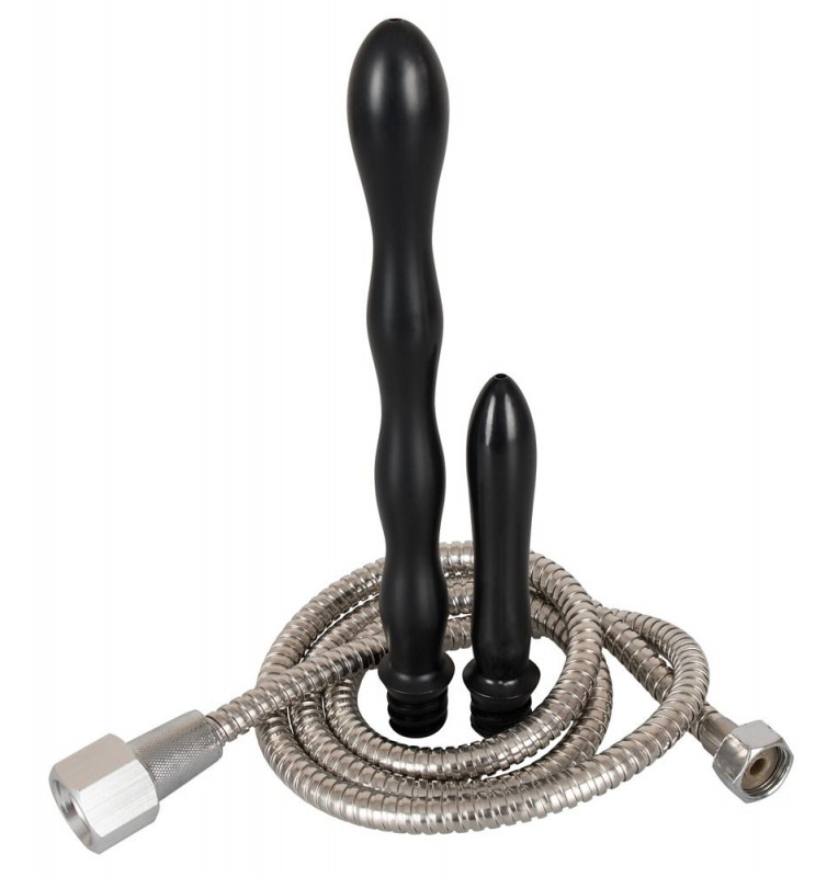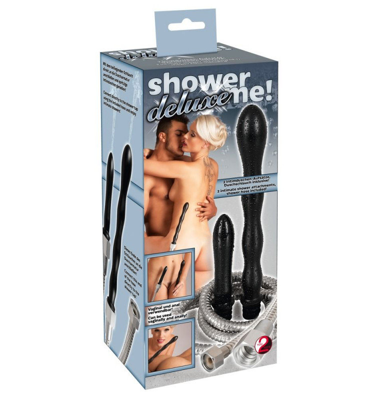 Набор для интимного душа Shower me Deluxe. Состоит из металлического шланга и двух насадок различной длины, предназначенных для вагинального или анального интимного душа. Одна насадка длинная, фигурная, расширенная на кончике. Вторая короткая, узкая, конической формы. Длина шланга - 138 см. Длина малой насадки - 12 см., диаметр - 2,3 см. Длина большой насадки - 23 см., диаметр - 3 см.