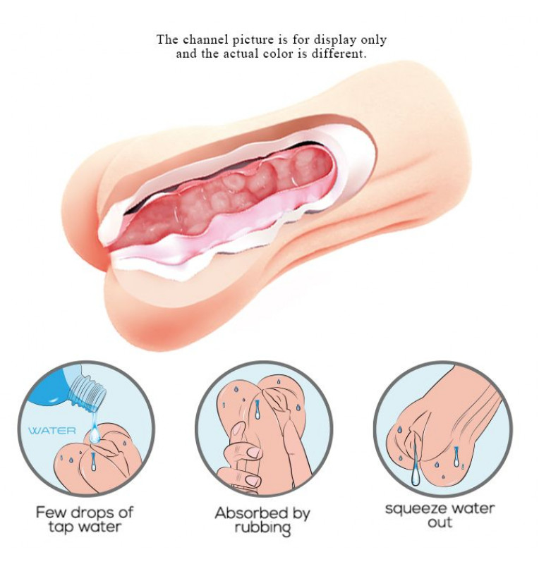 Мастурбатор с вагинальным отверстием изготовлен из особенного материала. Особенность заключается в том, что при добавлении нескольких капель воды в тоннель мастурбатора, материал принимает консистенцию скользящей, увлажняющей смазки. Имеет натуральный телесный цвет и очень правдоподобные внутренние складки, которые приносят ощущение полноценного сексуального контакта за счет плотного облегания ствола пениса.